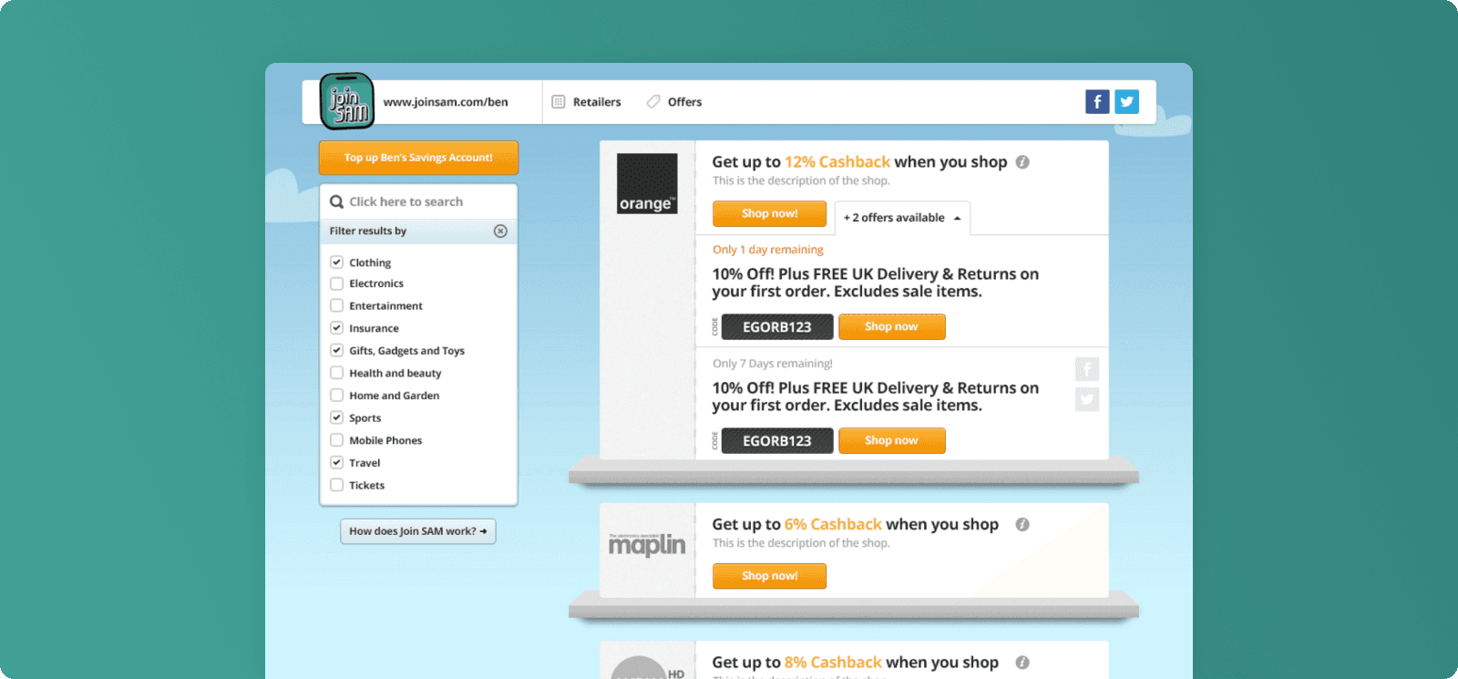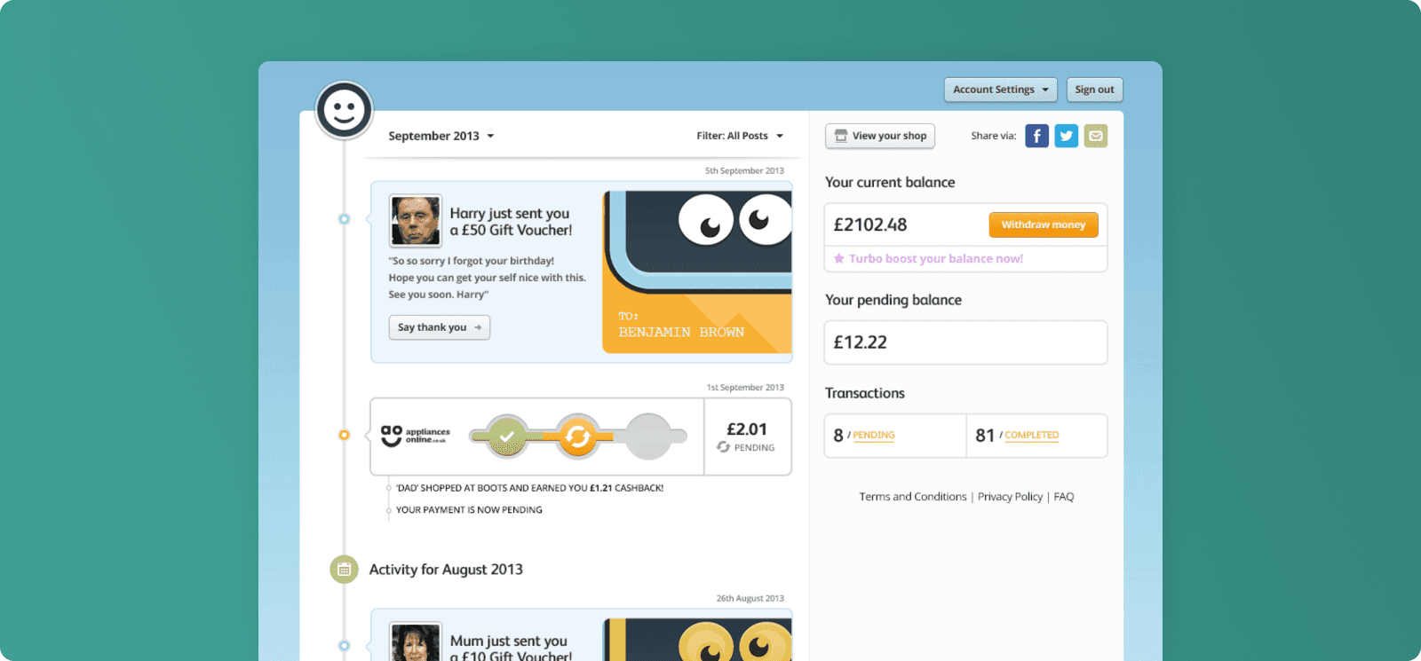The key thing we wanted to address was to help children learn about the money they save, and earn money by way of rewards whilst doing it. Giving the children a digital vault where they can store their birthday money, or their pocket money but allowing them to supplement their balances with cashback when their parents buy online via their very own virtual shop gave them their first foray into the world of tangible financial benefit. Each time the child recieves the cashback their parents have earned for them, they would get the opportunity to 'turbo-boost' their earnings by answering correctly 3 questions based around the money they've just recieved.
